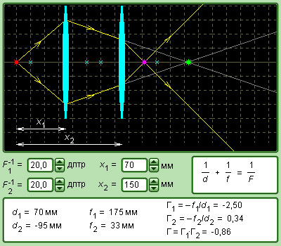 Во многих оптических приборах свет последовательно проходит через две или несколько линз. Изображение предмета, даваемое первой линзой, служит предметом (действительным или мнимым) для второй линзы, которая строит второе изображение предмета. Это второе изображение также может быть действительным или мнимым. Расчет оптической системы из двух тонких линз сводится к двукратному применению формулы линзы, при этом расстояние